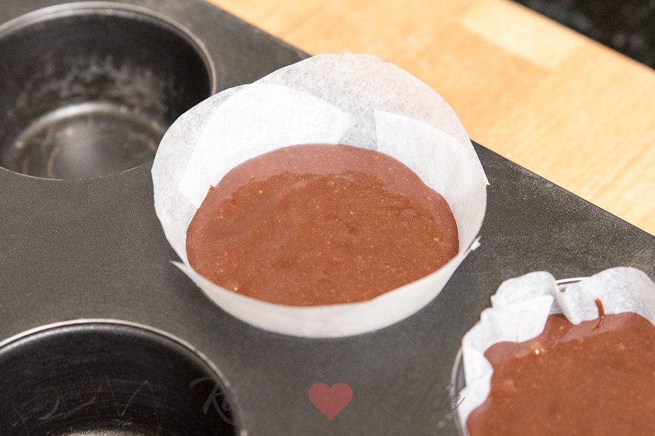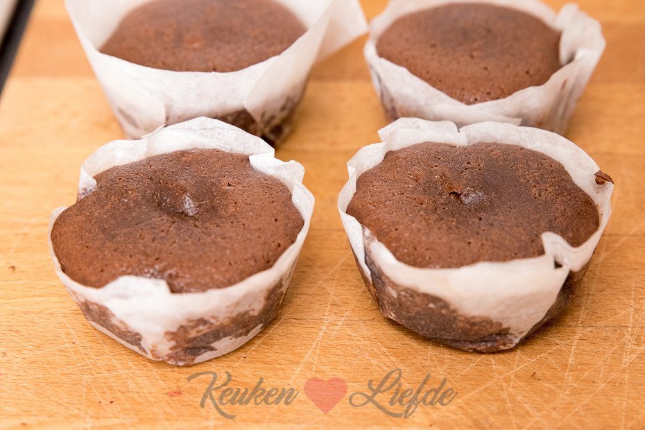 Vul een muffinbakblik met cups van bakpapier. Schep elke muffinholte tot net onder de rand vol met beslag. Bak de moelleux 10 minuten in de oven.