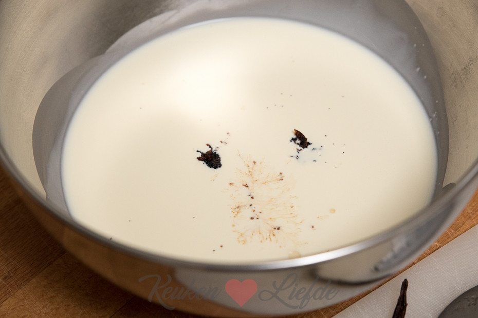 Snijd de vanillepeul open en schraap met een mes de vanillemerg eruit. Klop de slagroom samen met de vanillemerg en de 2 el bruine suiker stijf. Spatel de bourbon erdoor.
