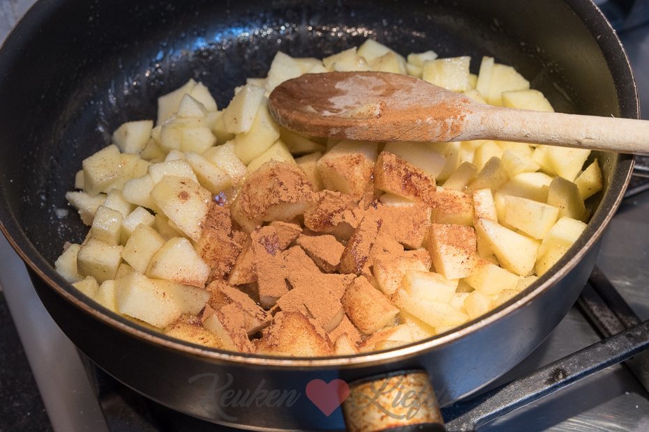 Schil de appels, verwijder het klokhuis en snijd in blokjes. Verhit een koekenpan met 25 gram roomboter en voeg de appel, suiker en kaneelpoeder toe. Bak op middelhoog vuur circa 8 minuten, of totdat de appels wat zachter zijn en je een soort grove appelcompote hebt. Schep de appelcompote op een bord en laat afkoelen.