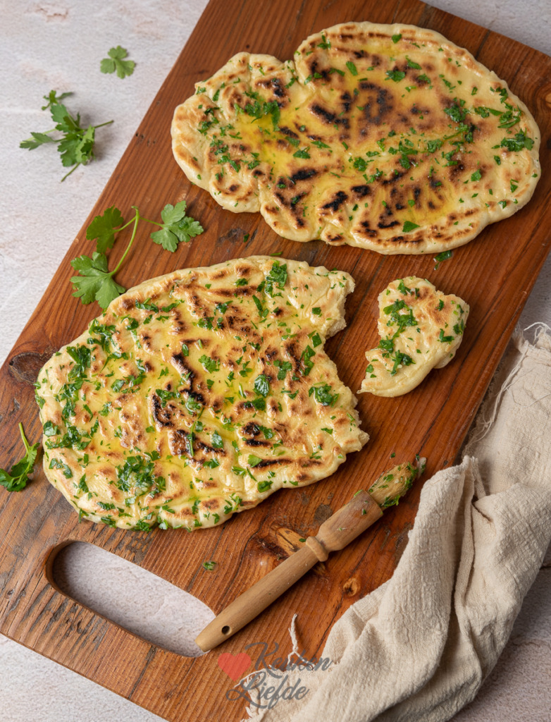 Met dit recept maak je twee flinke naanbroden, of vier kleinere stuks naan. Het luchtig gebakken naanbrood wordt na het bakken royaal bestreken met knoflookboter wat het platbrood lekker smeuïg maakt.