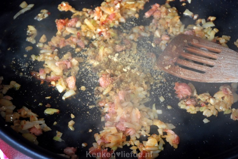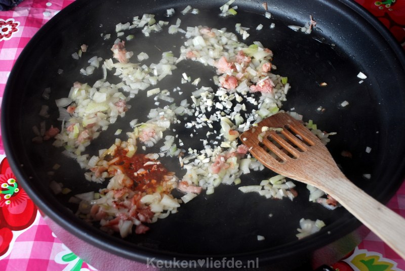 Circa 400 gram rijst en 5 plakjes bacon… Komt niet zo nauw. Luister vooral naar je eigen gevoel.