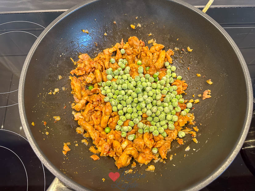 4. Voeg de kool en doperwten toe en bak 2 minuten mee.