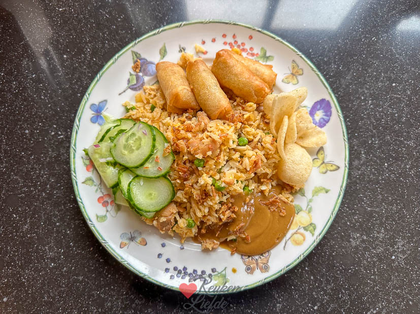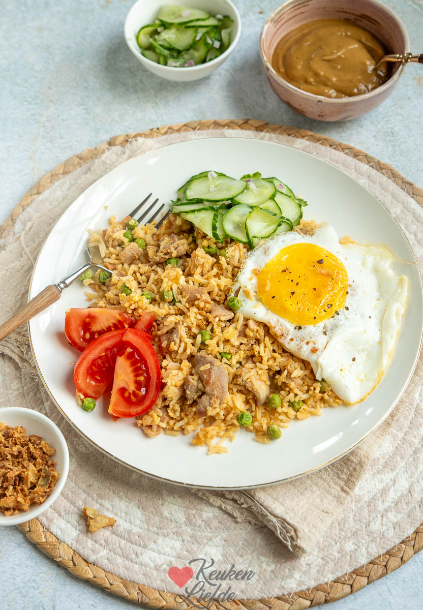 Heerlijke nasi met kip, ei en bacon. Ik serveer er een frisse, zoetzure komkommersalade bij en uiteraard mag de pindasaus niet ontbreken. Ook lekker met kroepoek en mini loempiaatjes erbij.
