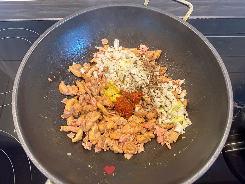 1. Verhit een grote wokpan met een scheutje olie. Voeg de bacon toe en bak 2 minuten op middellaag vuur.