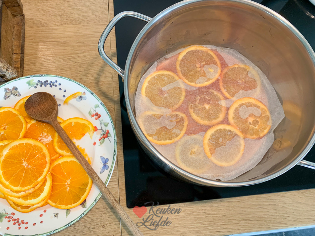 Gebruik voor het pocheren van de plakken sinaasappel voor de bovenkant een pan met een groot oppervlakte, of doe dit in meerdere stappen. Het is belangrijk dat de sinaasappelplakken in een enkele laag worden gepocheerd, anders krijg je geen goed resultaat.