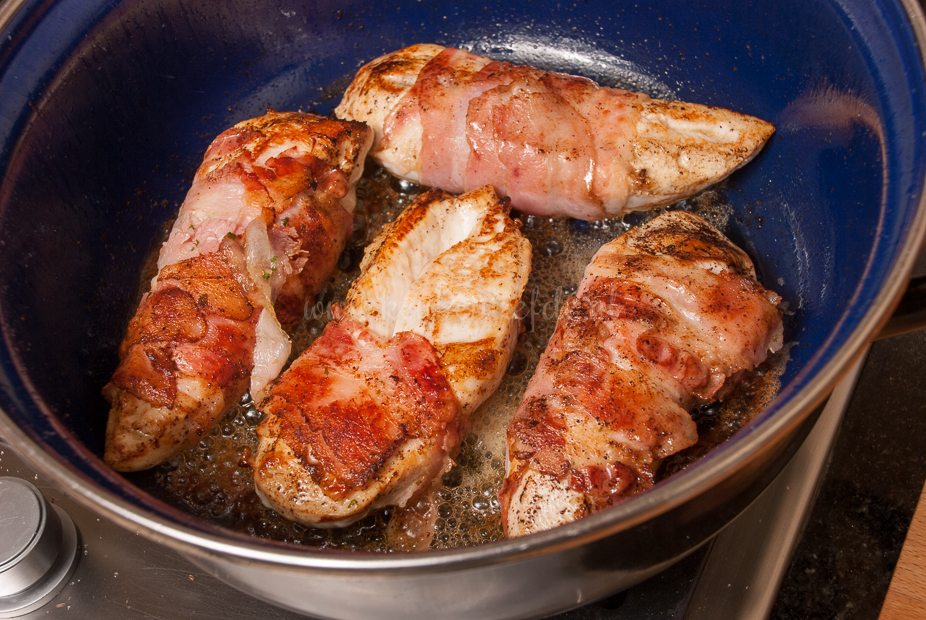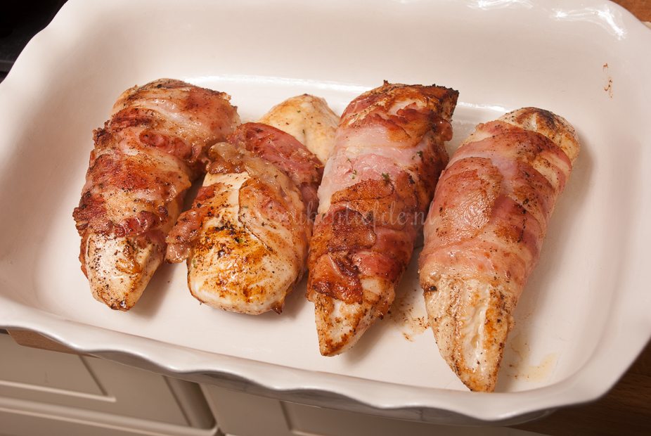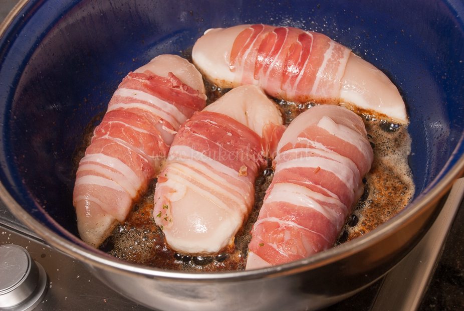 Verhit de hapjespan met wat boter. Bestrooi de kipfilets met zout en peper en omwikkel ze met ontbijtspek. Bak de kipfilets rondom goudbruin in de boter. Je hoeft de kipfilets niet helemaal gaar te bakken, want ze garen zometeen nog verder in de oven. Leg de kipfilets in de ovenschaal.