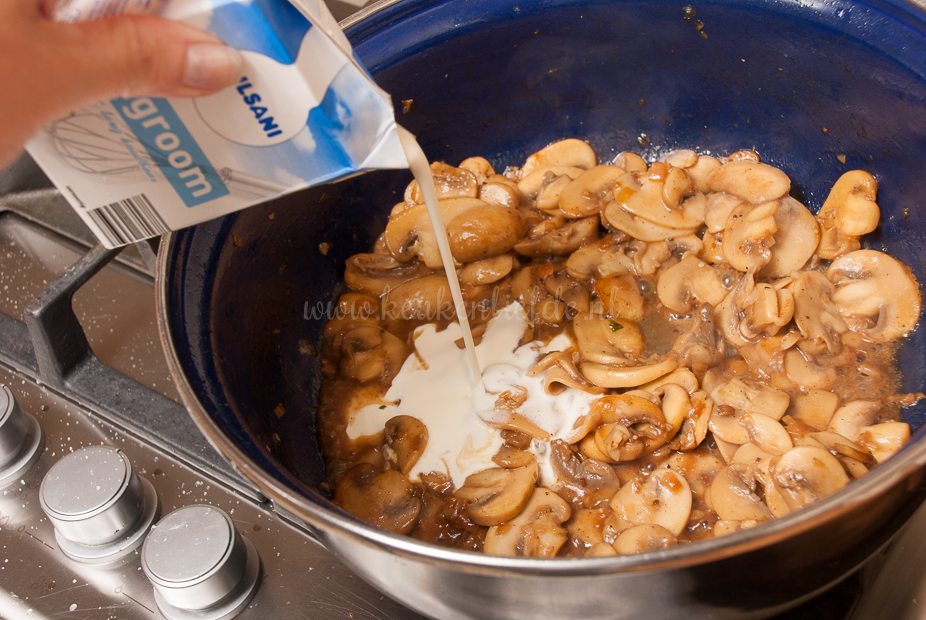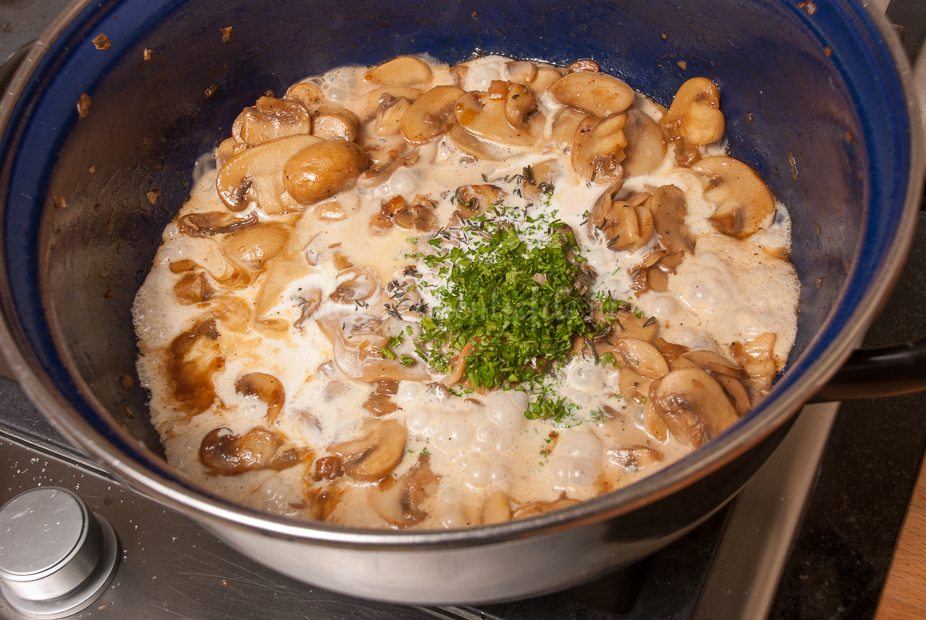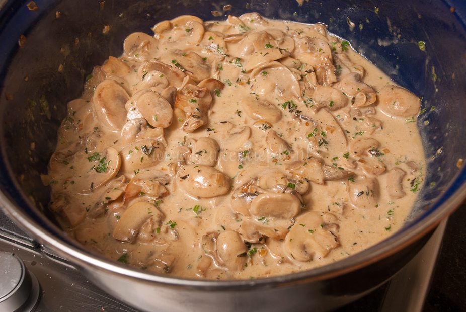 Ik strooi wat bloem over de champignons en gebruik Creme Fraiche ipv slagroom.