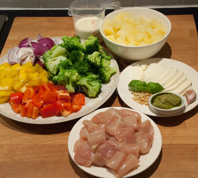 Hoi Michelle, je kunt wel de broccoli al voorkoken, kip bakken, aardappels voorkoken en paprika snijden en die afgedekt in de koelkast bewaren. Vlak voordat je hem wilt eten hoef je dan alleen nog alles in de ovenschaal te doen, de pestoroom eroverheen te schenken en de mozzarella erop te leggen.