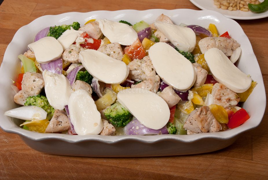 Verdeel de broccoli, kip, krieltjes, paprika en rode ui over de ovenschaal, bestrooi met zout en peper en schenk de pestoroom eroverheen. Bedek met de mozzarella. Bak 30 minuten in de oven, of totdat de kaas goudbruin is en de krieltjes zacht zijn.