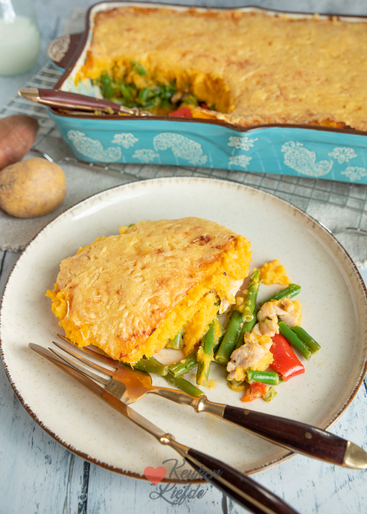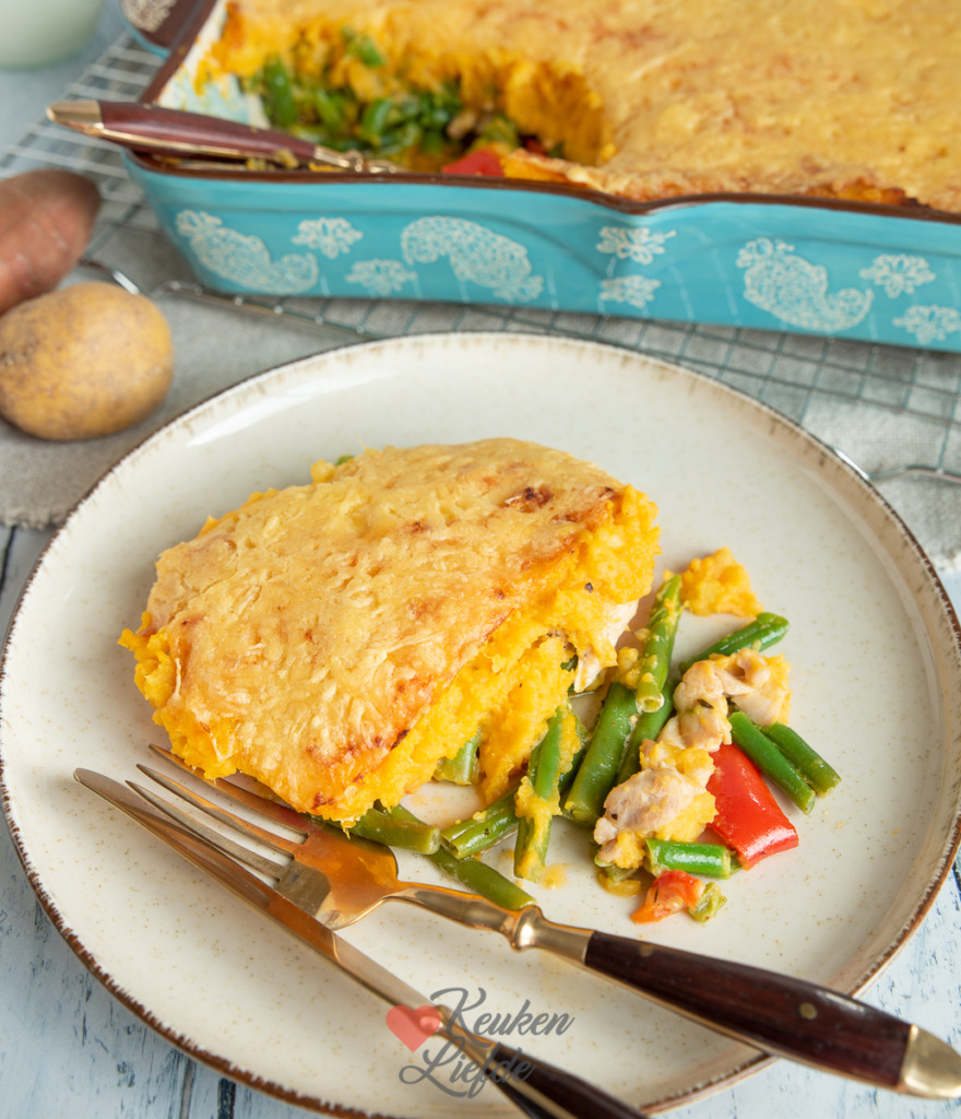 Een heerlijke ovenschotel met kip en sperziebonen afgedekt met zoete aardappelpuree en kaas. Deze ovenschotel was een grote hit bij ons thuis. De zoete aardappelpuree combineert fantastisch met de licht pittige cajunkip en sperziebonen en maakt de schotel net iets spannender dan met gewone aardappelpuree. Je gratineert hem met kaas in de oven waardoor de bovenkant een heerlijk knapperig kaaskorstje krijgt.
