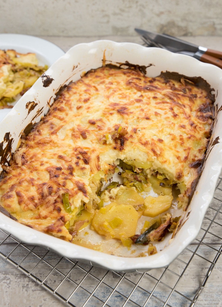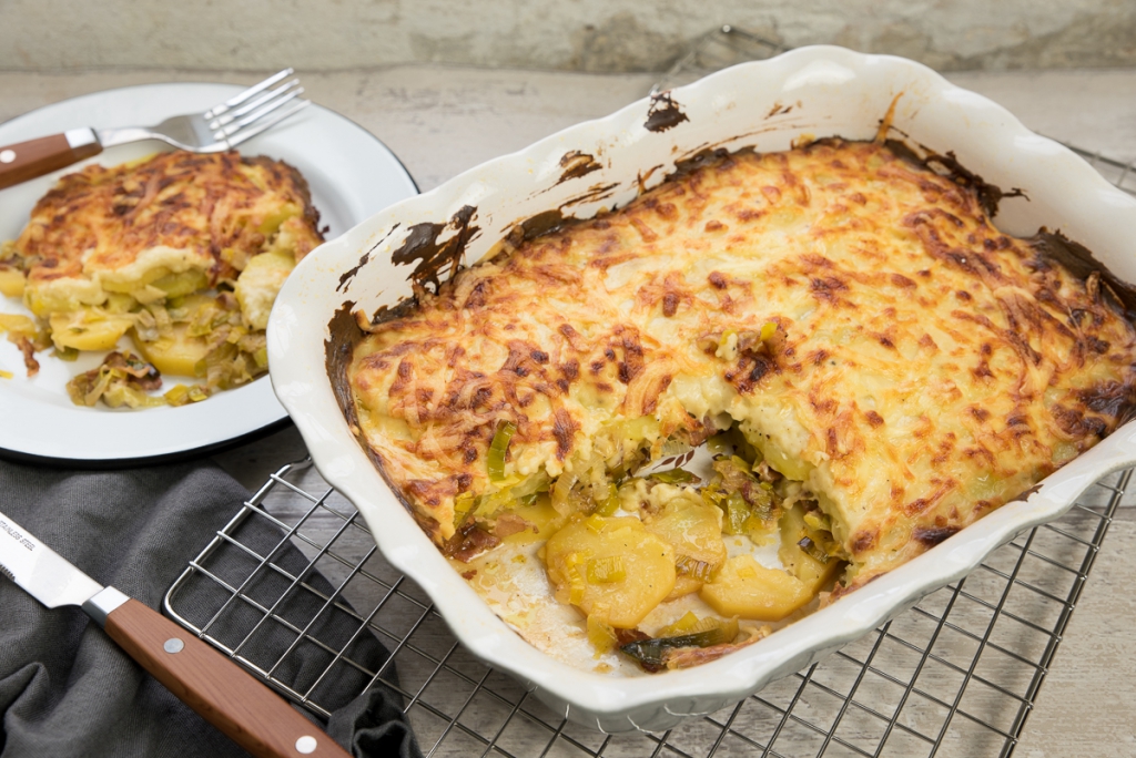 Verwarm de oven voor op 200 graden. Vet de ovenschaal in en bekleed de bodem met de helft van de aardappel. Verdeel het preimengsel over de aardappel. Schep de helft van de saus over de prei. Bedek met de overige aardappel en de saus. Bestrooi met de overige kaas.