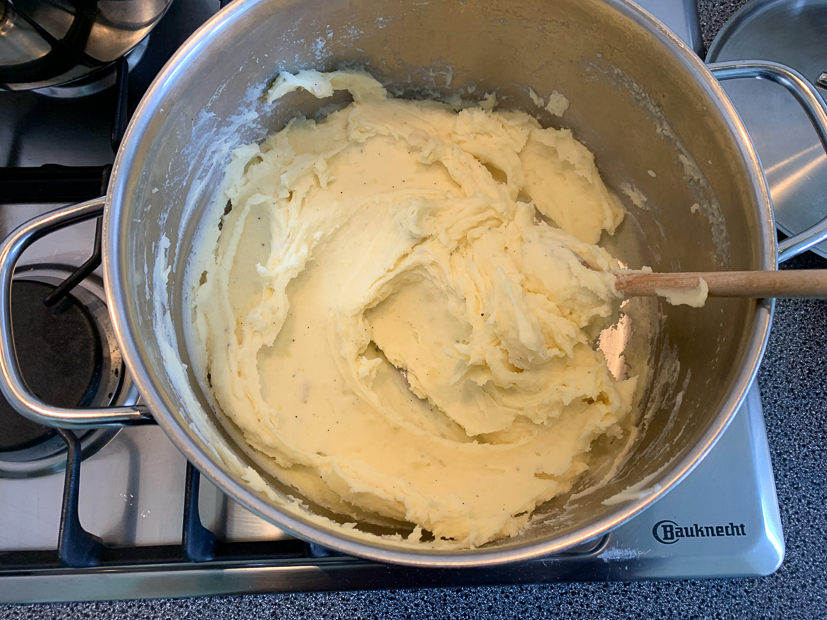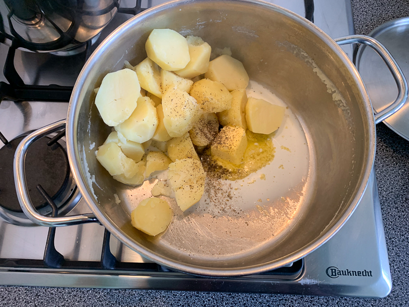 Kook de aardappels gaar in een ruime pan met licht gezouten kokend water. Giet de aardappels af en zet ze terug op zacht vuur. Voeg 40 gram roomboter en een scheut melk toe en stamp de aardappels fijn met de pureestamper. Breng goed op smaak met zout en peper uit de molen. De puree is goed als hij fluweelzacht en glad is, voeg indien nodig nog een extra scheutje melk toe als de puree te dik is.