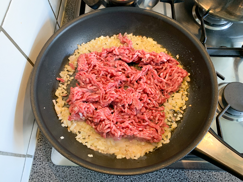 Verhit de koekenpan met een scheutje olijfolie en bak de sjalotten tot ze zacht en glazig zijn. Voeg het gehakt toe en breng goed op smaak met zout en peper uit de molen. Bak het gehakt rul op hoog vuur tot het bruin begint te kleuren. Gooi het gehakt in een zeef om het overtollig vet kwijt te raken. Verdeel het gehakt over de bodem van de ovenschaal en bedek met de rodekool.