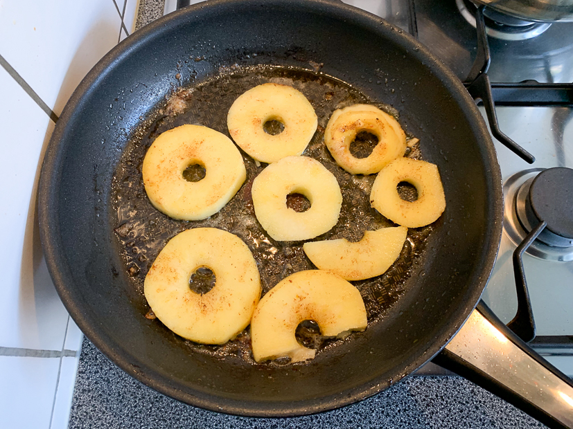 Veeg de koekenpan schoon met een stukje keukenpapier en verhit met 40 gram roomboter. Bak de appelschijven in de koekenpan op middelhoog vuur tot ze zacht zijn en beginnen te kleuren. Let op dat de roomboter niet verbrand, zet het vuur anders wat lager. Verdeel de helft van de gebakken appel over de rodekool.