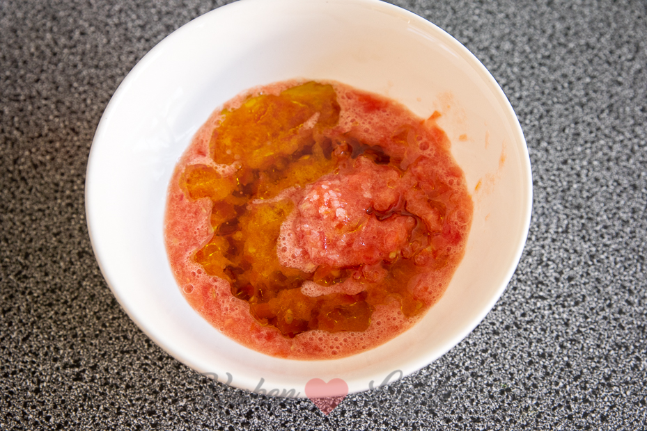 Snijd de tomaten in stukken en doe ze in de keukenmachine. Maal ze fijn tot moes. Doe de tomatenmoes in een kom en breng op smaak met een scheutje olijfolie en een snufje fleur de sel. Wrijf de fleur de sel eerst even fijn tussen je vingers voordat je hem toevoegt.
