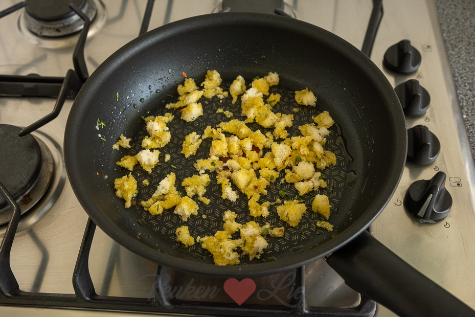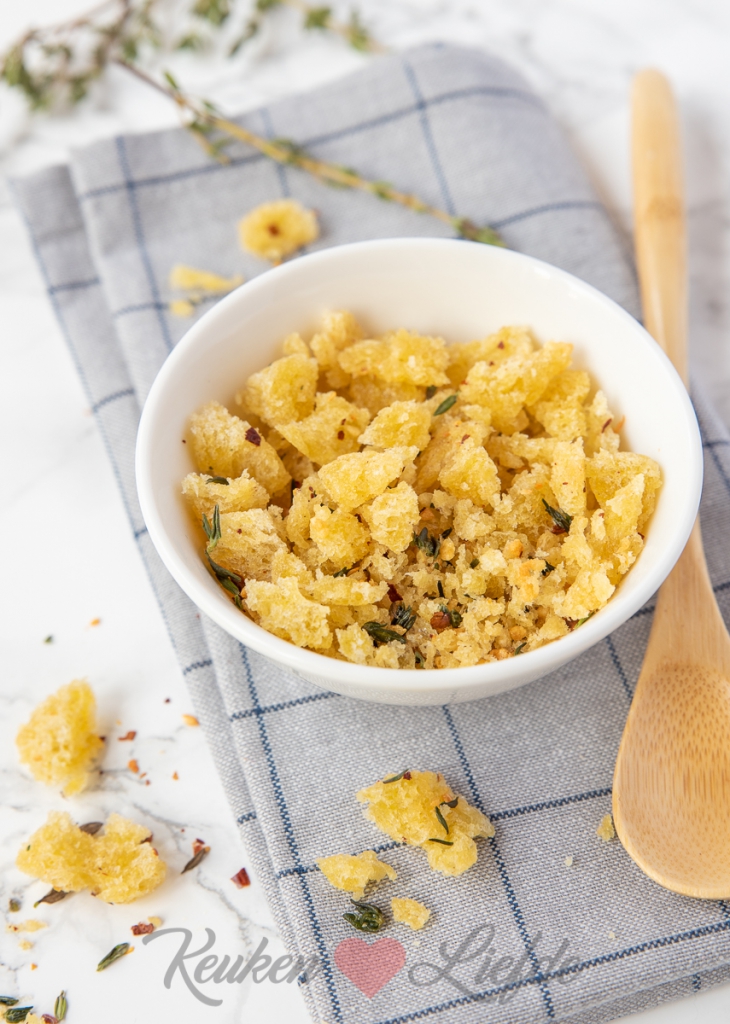 Restje oud brood over? Niet weggooien! Deze Italiaanse pangritata is de ideale kliekjesverwerker voor oud brood! In Italië gebruiken ze pangritata als krokante broodkruim topping om over gerechten te strooien. Ze noemen het ook wel Poor Man’s Parmesan omdat het een goedkoper alternatief is voor Parmezaan. Lekker om over pasta of soep te strooien!