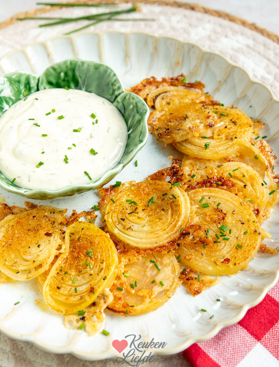 Parmezaan uienringen uit de oven – Deze krokante parmezaan uienringen zag ik zo vaak voorbijkomen op social media dat ik ze wel moest proberen. Je hebt, op wat smaakmakers na, maar twee ingrediënten nodig om ze te maken: parmezaan en uien. De uienringen worden lekker zacht gebakken in de oven,  de parmezaan wordt goudbruin en krokant. Serveer ze lauwwarm als snack of borrelhapje met een lekker (knoflook)sausje erbij.