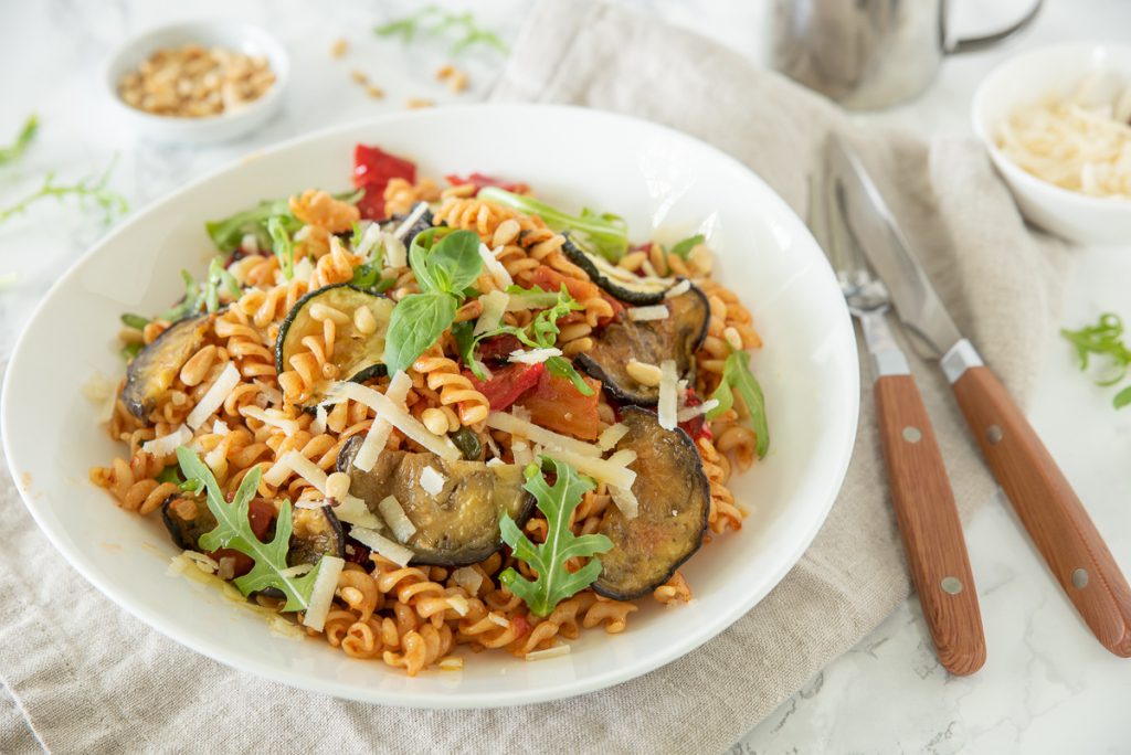 Kook de pasta beetgaar volgens de omschrijving op de verpakking in een ruime pan met kokend water. Giet de pasta af en doe terug in de pan. Voeg de tomatensaus toe aan de pasta en hussel door elkaar. Verdeel de pasta en gegrilde groenten over twee borden en garneer met wat rucola, pijnboompitten en Parmezaan. Druppel nog wat extra vierge olijfolie over de pasta en serveer.