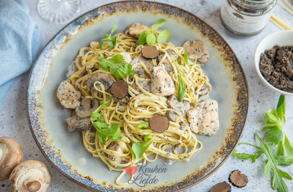Pasta met truffel, champignons en kip. Een heerlijk pastagerecht met romige truffelsaus, gebakken champignons en kip. Makkelijk om te maken en klaar in 15 minuten!