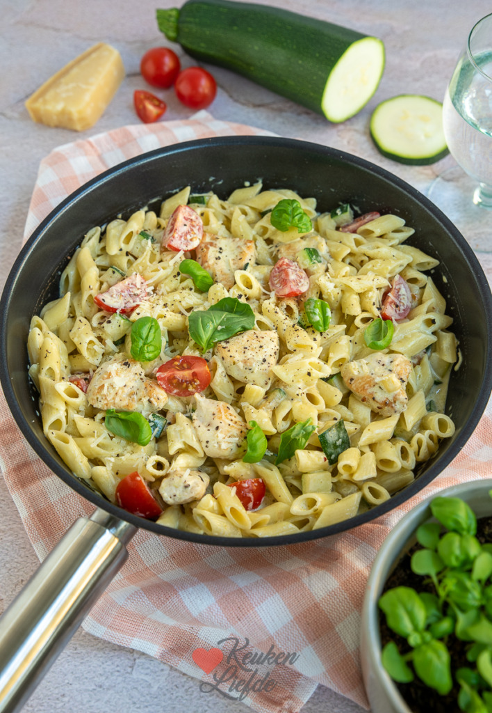Pasta pesto met kip en courgette – Pasta pesto is een van mijn favoriete pastarecepten. Het is makkelijk om te maken en je kunt er eindeloos mee variëren. Deze variant met kip en courgette maak ik graag in de zomer met courgettes en tomaatjes uit eigen moestuin.