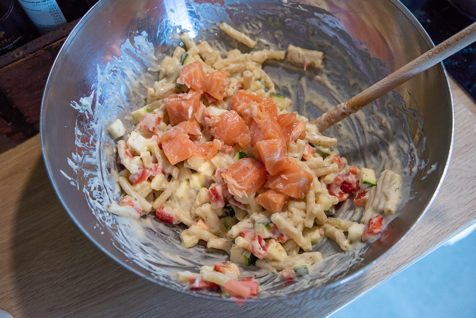 Kook de pasta beetgaar in een ruime pan met licht gezouten, kokend water. Spoel de pasta af met koud water en laat uitlekken in een vergiet. Hussel om met een scheutje olijfolie zodat hij niet gaat plakken.