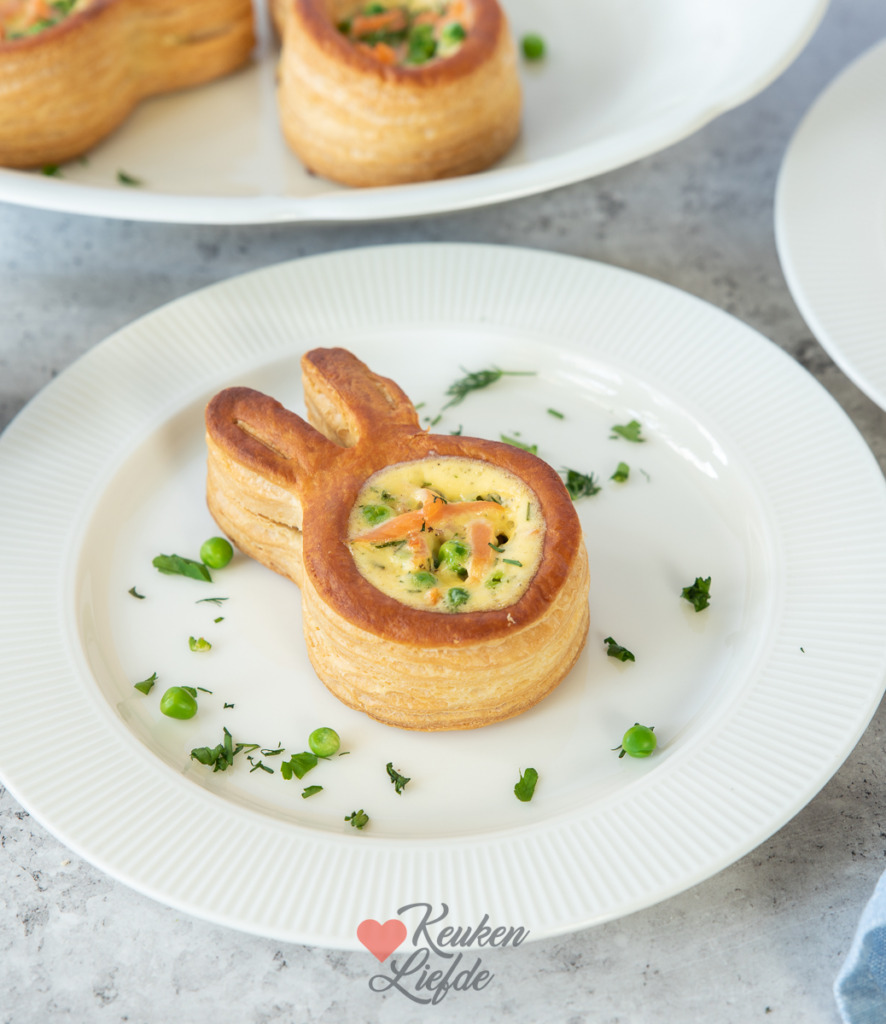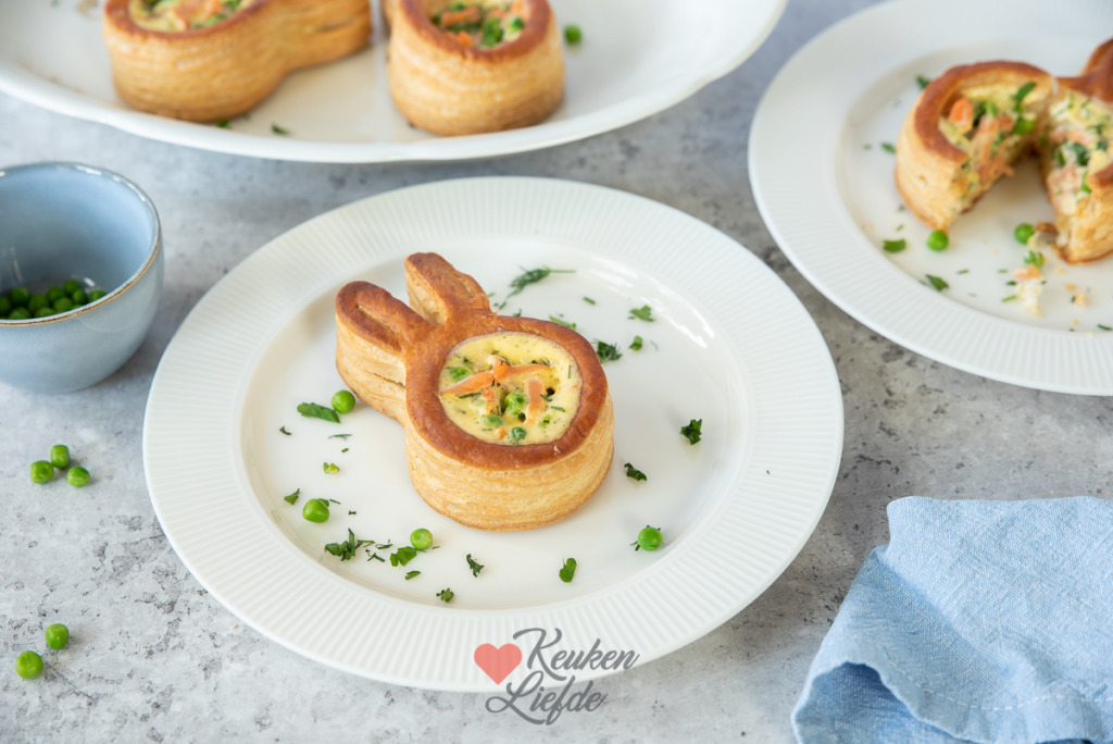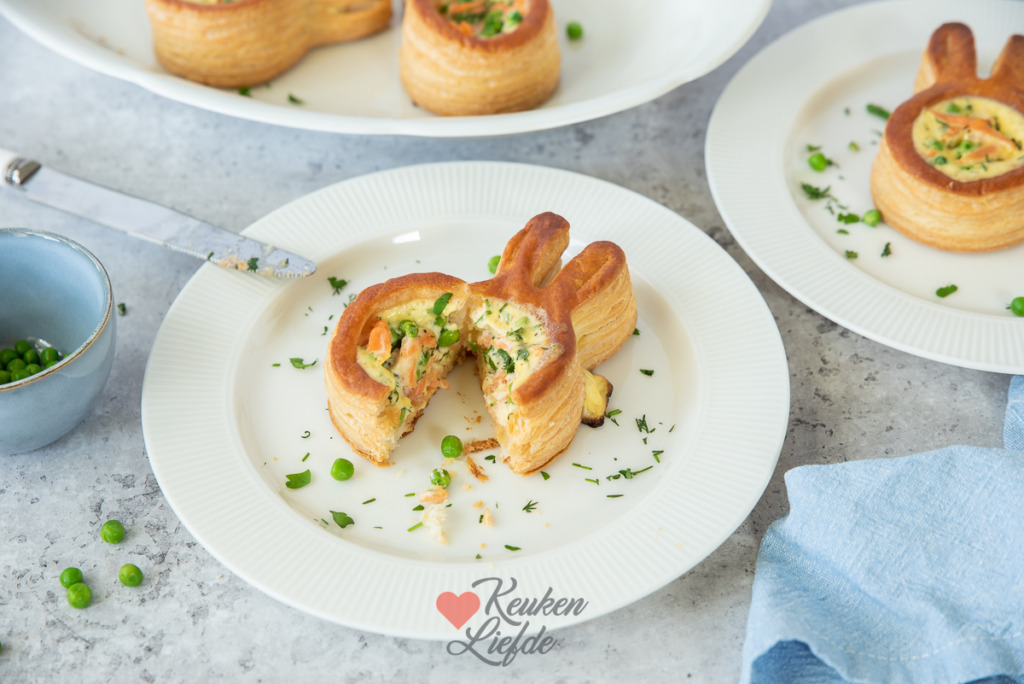 Nu het bijna Pasen is zie je in de winkel weer van die leuke pasteibakjes in de vorm van een paashaas liggen. Daar wilde ik iets mee doen. Ik besloot de ragout achterwege te laten en de pasteitjes te vullen met zalm, doperwten en een romige quichevulling van crème fraîche en ei. Een leuk voorgerecht om tijdens het paasdiner te serveren, of zet ze op tafel tijdens de paasbrunch.