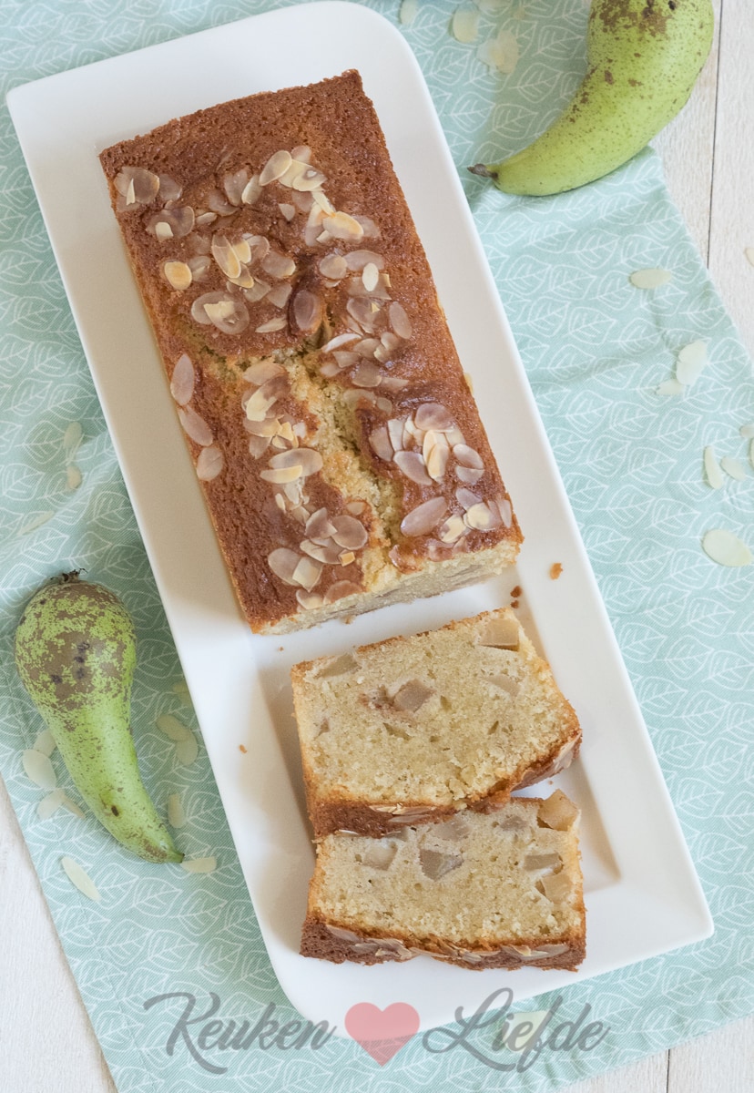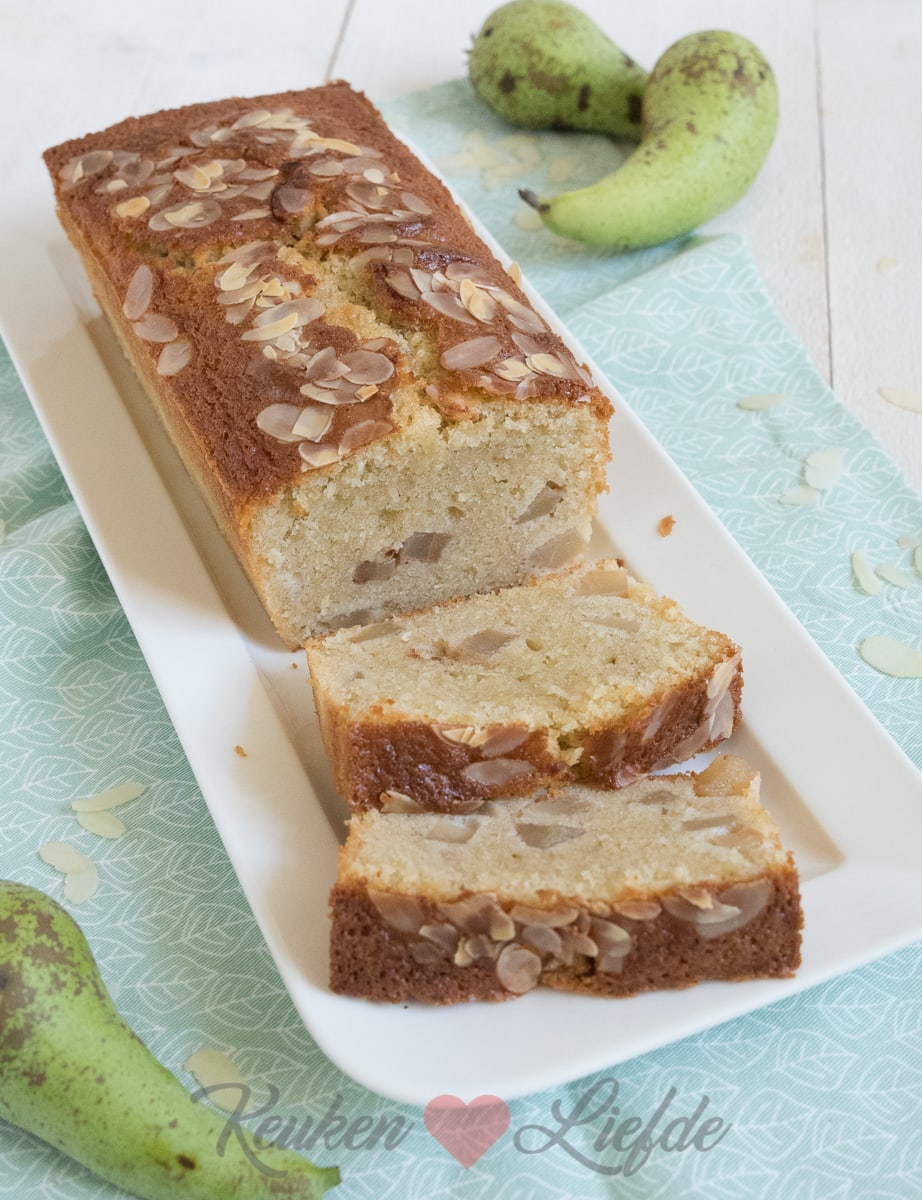 Zeef de bloem boven het beslag, doe dit in meerdere porties en spatel afgewisseld met de melk door het beslag. Spatel tot slot de perenblokjes (houd een paar blokjes achter) door het beslag en schep het beslag in het cakeblik. Bedek de cake met de achtergehouden perenblokjes en bestrooi met het amandelschaafsel.
