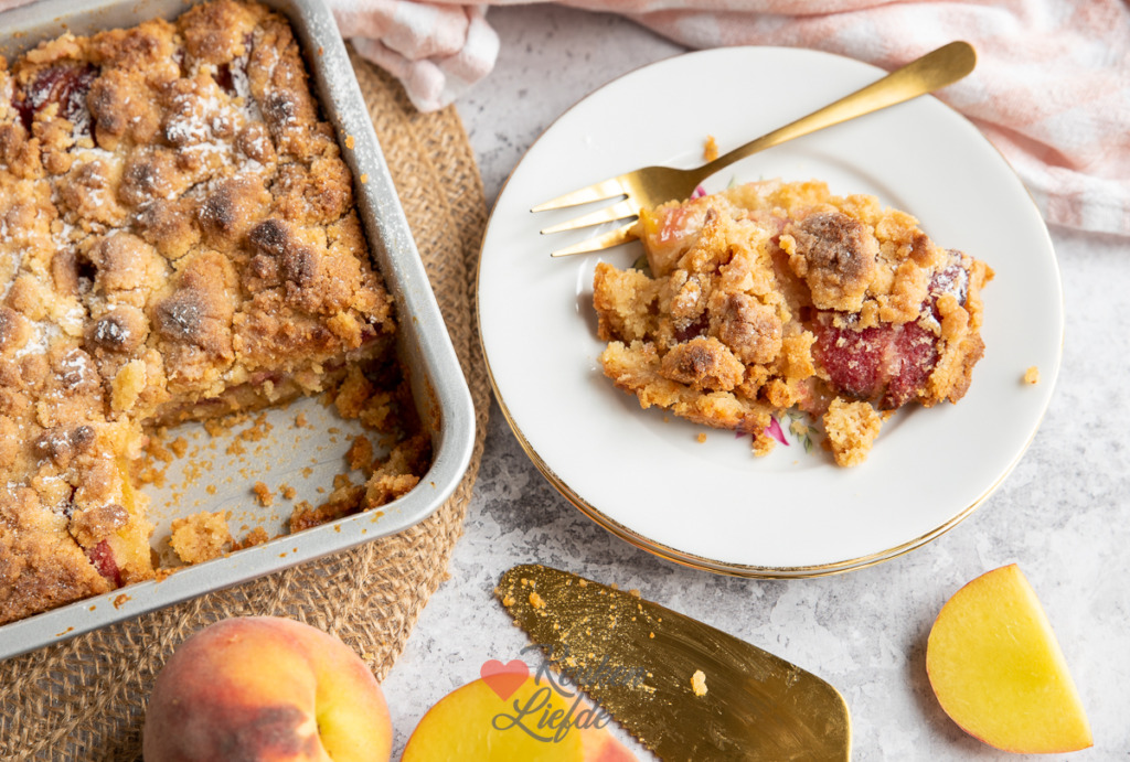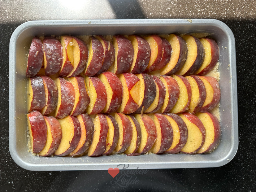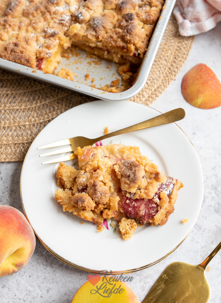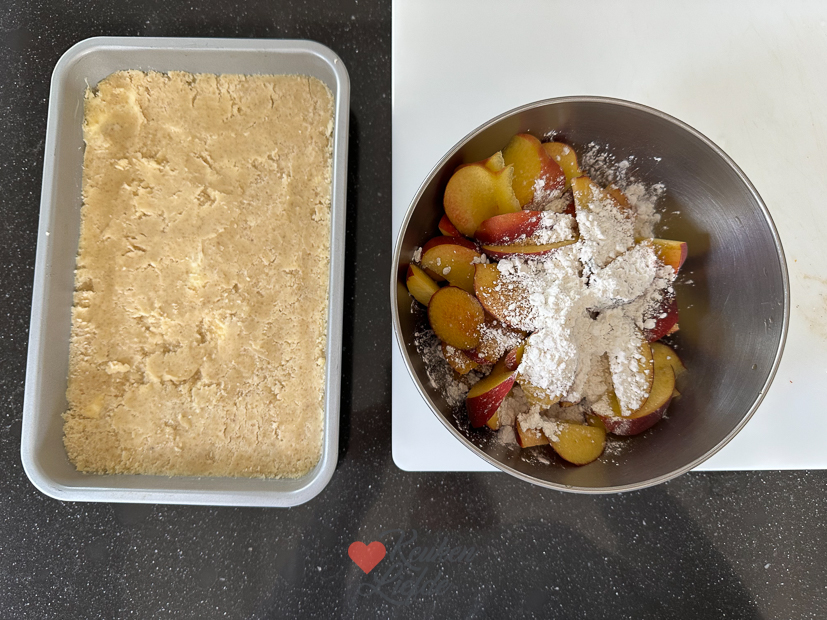 Deze perzik kruimeltaart maak ik op het bakblik en is supermakkelijk om te maken. De helft van het kruimeldeeg gebruik ik voor de bodem, de andere helft voor de kruimels bovenop.