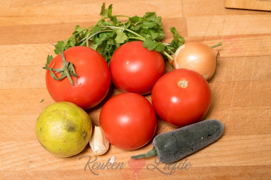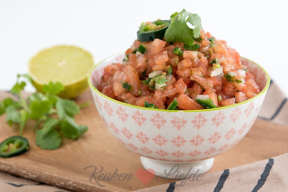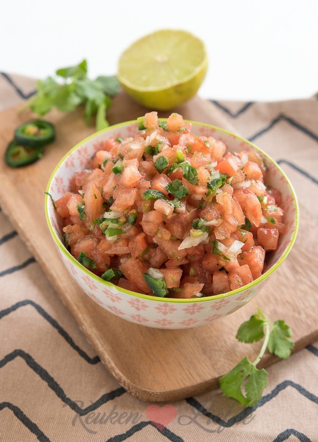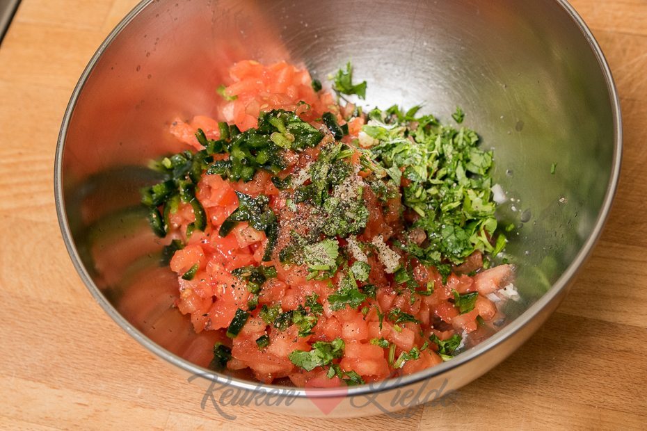 Meng de tomatenblokjes in een kom met de overige ingrediënten (gebruik zoveel jalapeño als je zelf lekker vindt) en breng op smaak met zout en peper.