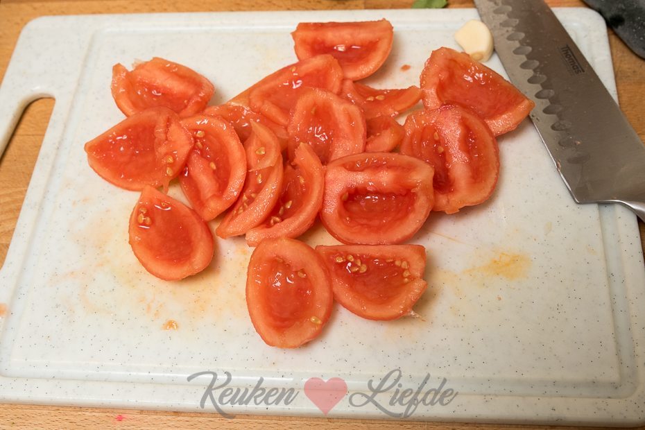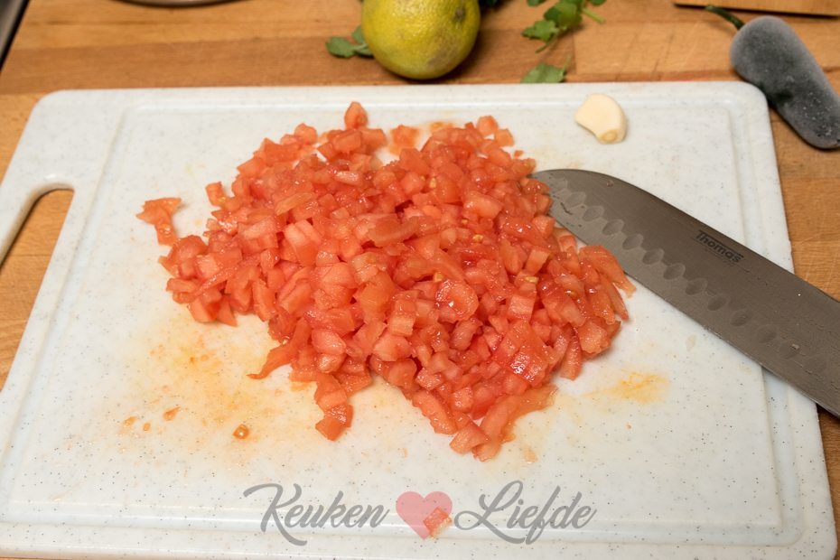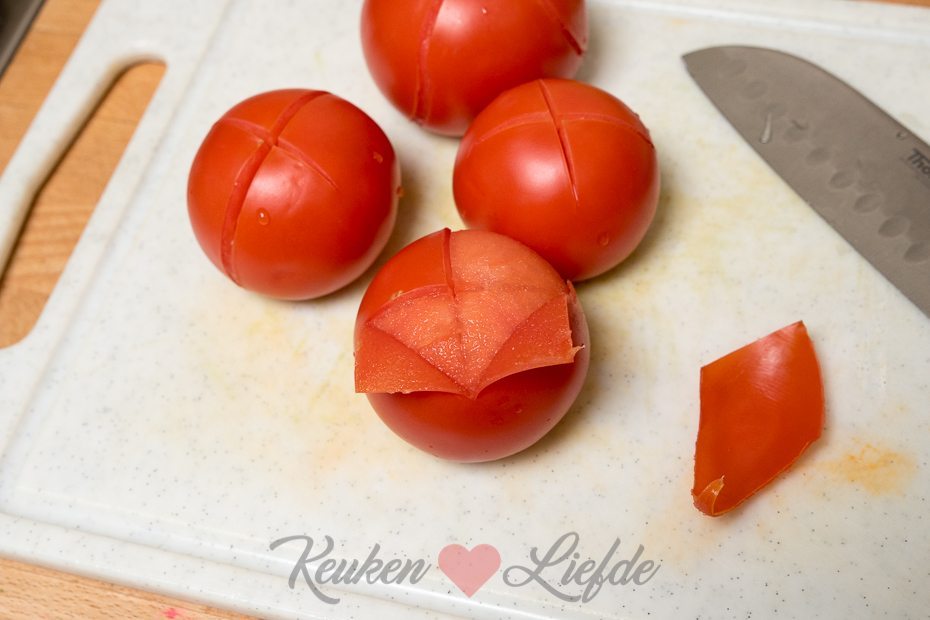 Kruis de tomaten aan de bovenkant in en dompel ze onder in een pan met kokend water. Laat ze enkele seconden liggen (niet te lang, want dan worden de tomaten melig), totdat je het tomatenvelletje makkelijk los kunt trekken. Trek het tomatenvel eraf en verwijder het sap en zaadlijsten uit de tomaten. Snijd het vruchtvlees in kleine blokjes.