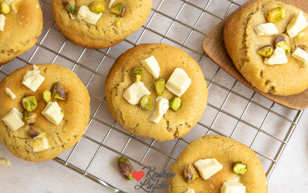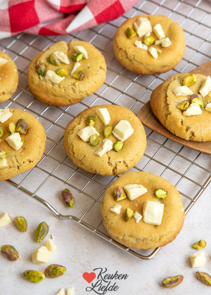 Deze pistache koekjes met witte chocolade zijn een echte traktatie. Ze hebben een zachte, fijne pistachesmaak en de stukjes witte chocolade geven een lekkere bite. Bovendien zijn deze koekjes heel makkelijk om te maken.