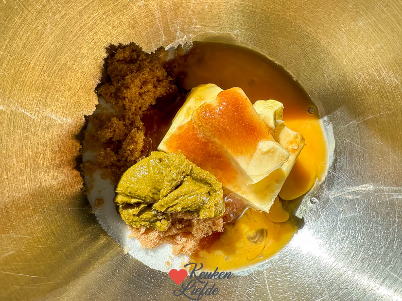 Mix de basterdsuiker, kristalsuiker, pistachepasta, roomboter, het ei en de eidooier in een kom tot een glad mengsel.