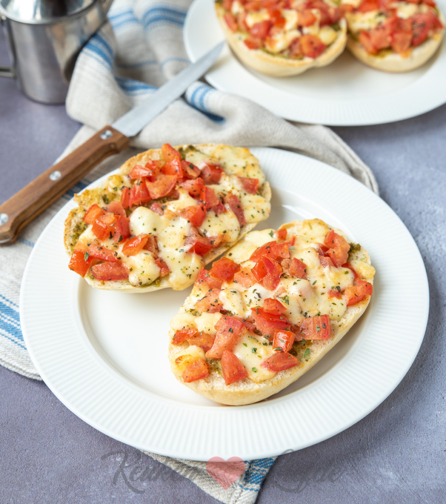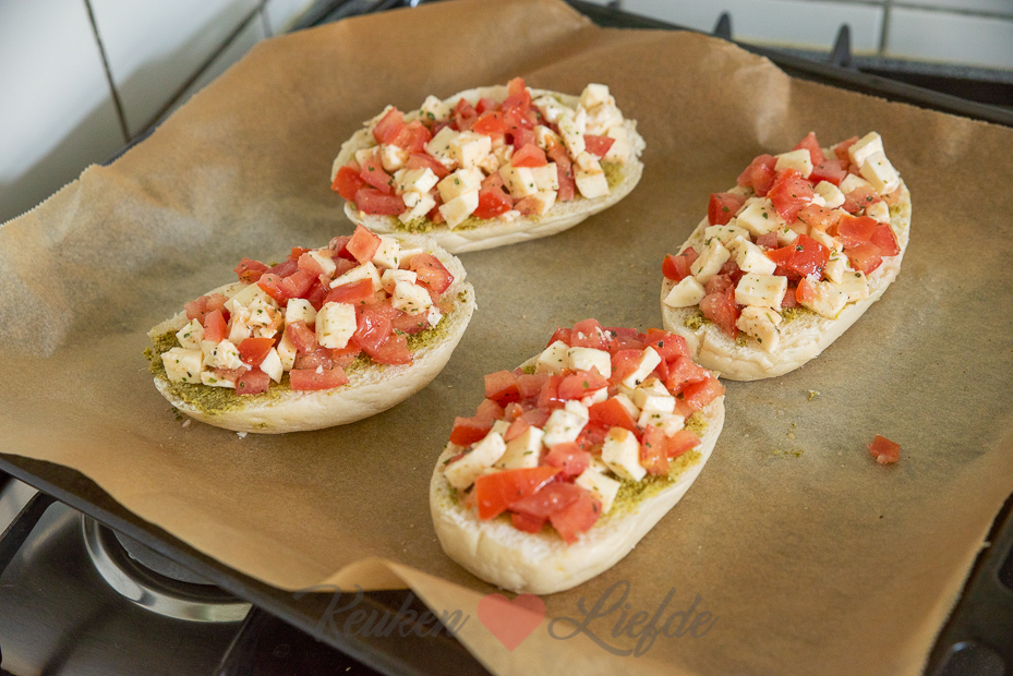 Een warme pistolet uit de oven belegd met pesto, tomaat en smeltende mozzarella. Heerlijk als lunch, warme snack tussendoor, of serveer bij een kommetje soep voor het avondeten!