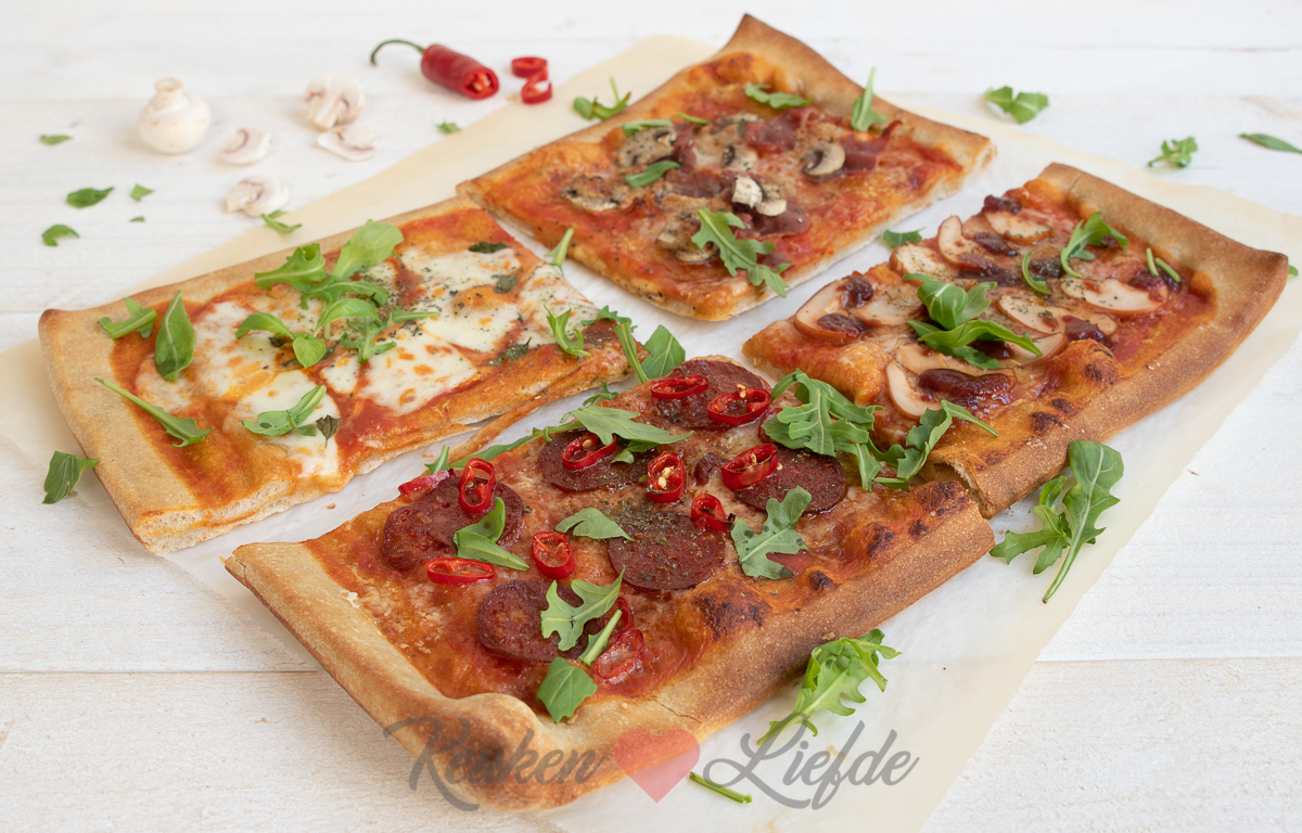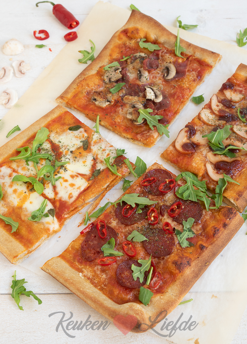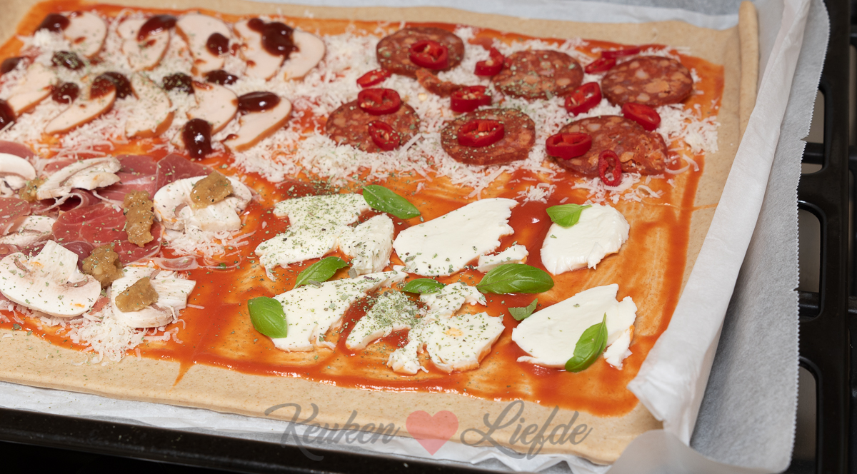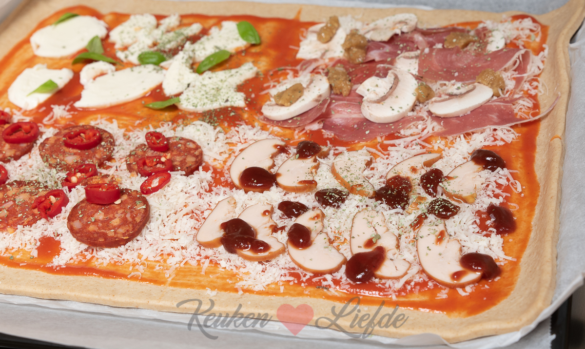 Beleg de pizza in 4 smaken met de verschillende toppings. Begin altijd eerst met de kaas en dan de overige ingrediënten. Bestrooi de pizza met wat gedroogde oregano.