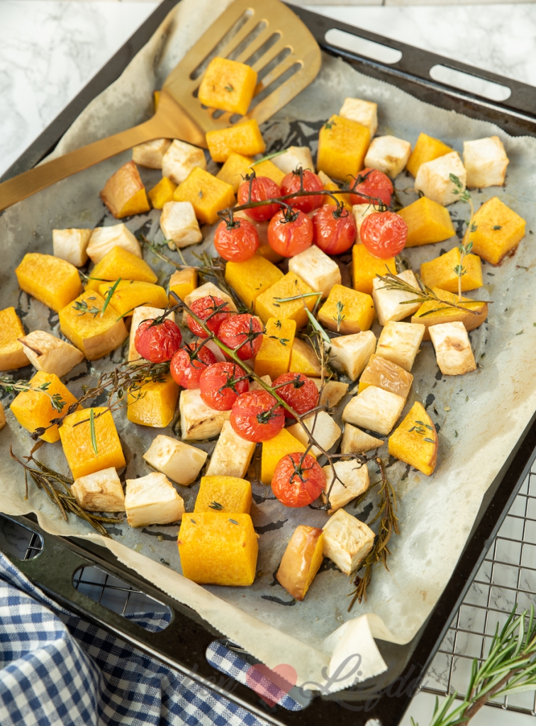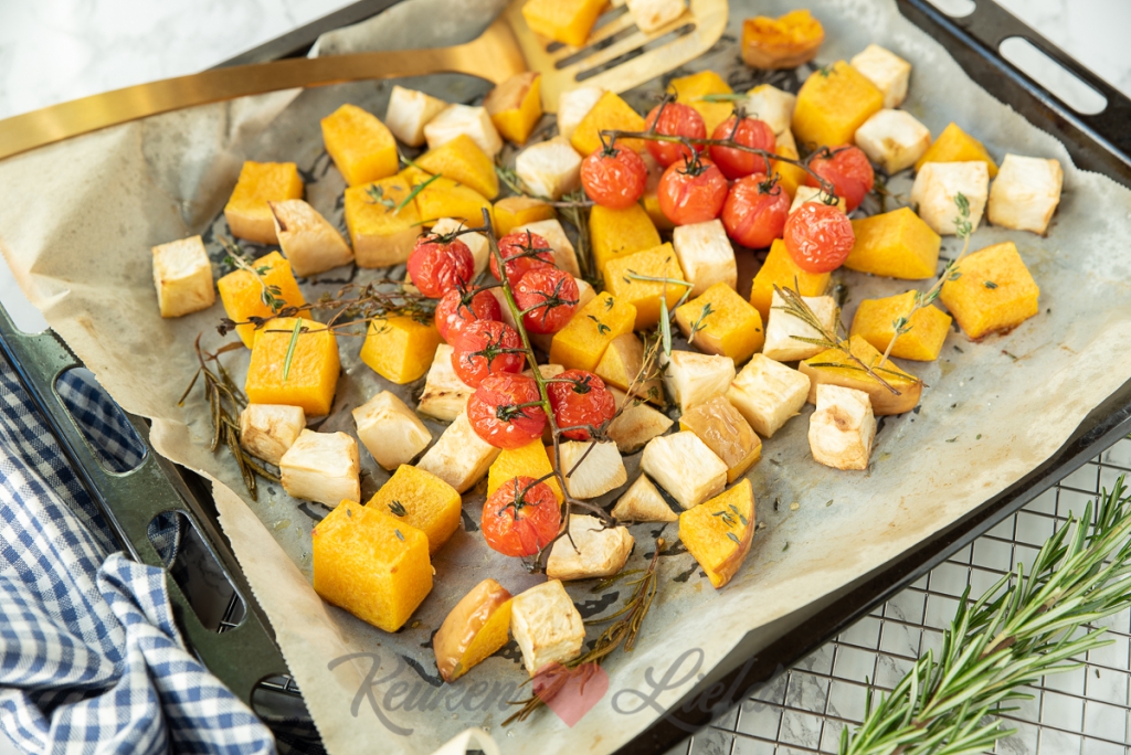 Een lekker groentegerecht op tafel zetten zonder veel moeite? Groenten uit de oven zijn lekker en gezond! Deze pompoen, knolselderij en trostomaat worden lekker zacht en zoet door ze te roosteren in de oven. Op wat snijwerk na heb je er bijna geen werk aan.