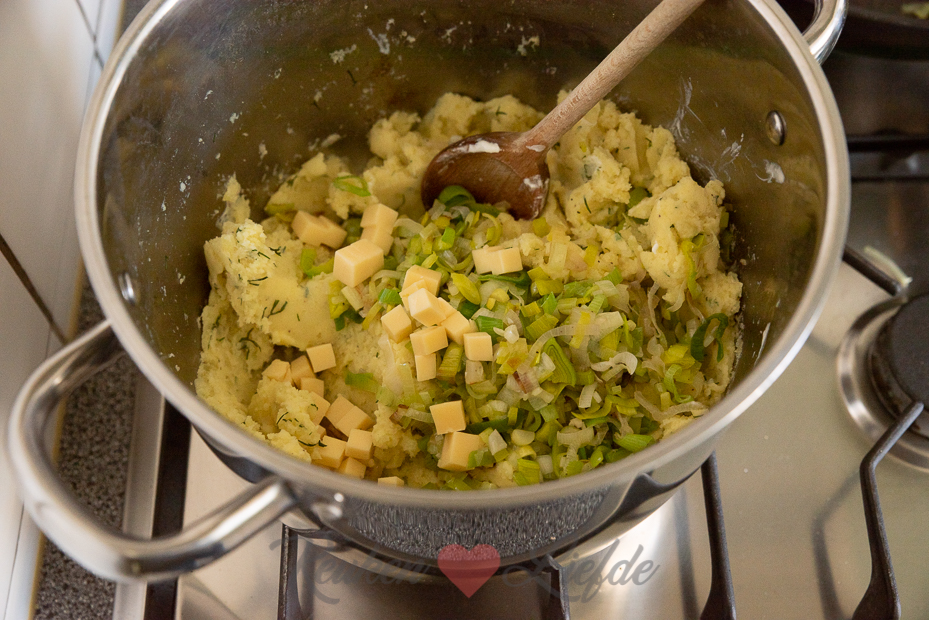 Een heerlijke preistamppot met blokjes belegen kaas en knapperige vissticks. De vissticks kun je heel makkelijk zelf maken door stevige visfilet te kruiden, in repen te snijden en vervolgens door bloem, losgeklopt ei en paneermeel te wentelen. Bakken in ruim boter en smullen maar. Vind je dat teveel werk of heb je daar geen tijd voor, dan kun je natuurlijk ook vissticks kopen.