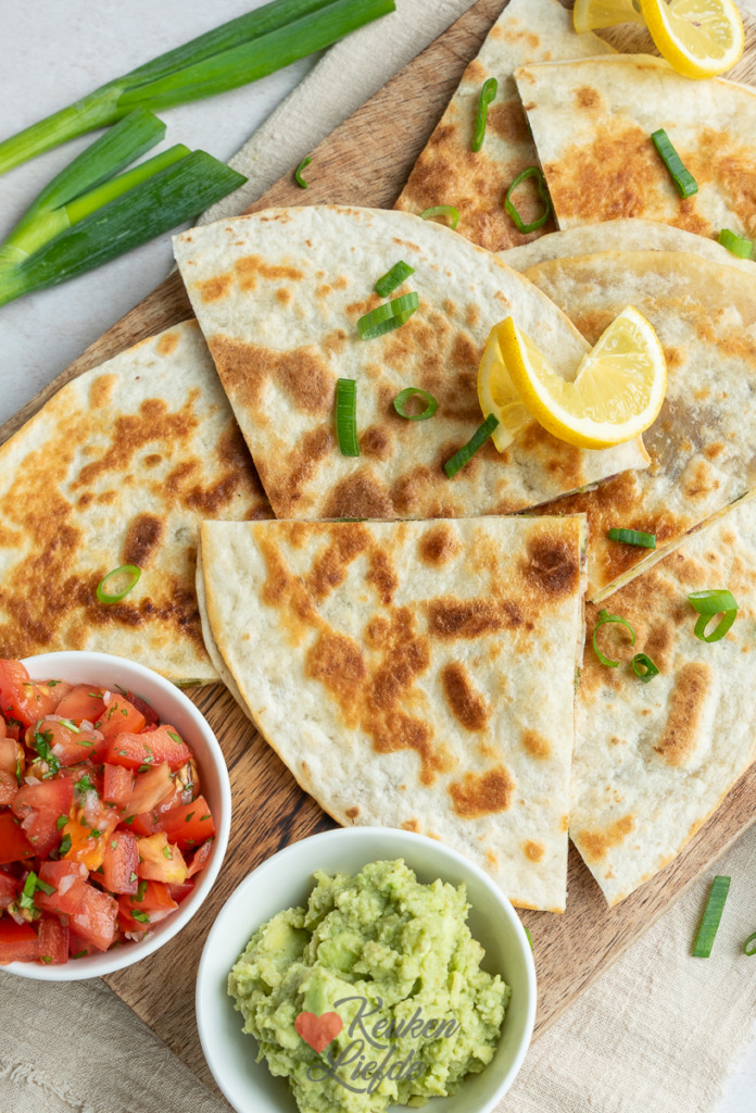Deze Mexicaanse quesadilla met kaas, bosui en bonenpuree is heerlijk als vegetarische maaltijd of lunch. Serveer met zelfgemaakte guacamole, tomatensalsa en zure room om het smulfeest compleet te maken.