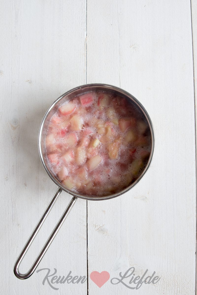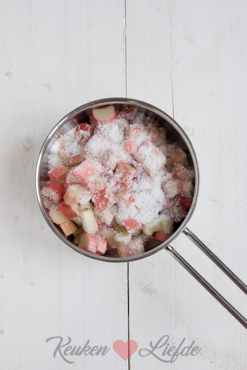 Was de rabarberstengels en dep ze droog. Verwijder eventuele harde, uitgedroogde uiteinden en snijd de rabarber in stukken van circa 2 cm. Doe de rabarberstukjes in een kookpan met de suiker — voeg meer of minder suiker toe afhankelijk van de zuurheid van de rabarber en afhankelijk van je eigen smaak — en het citroensap.