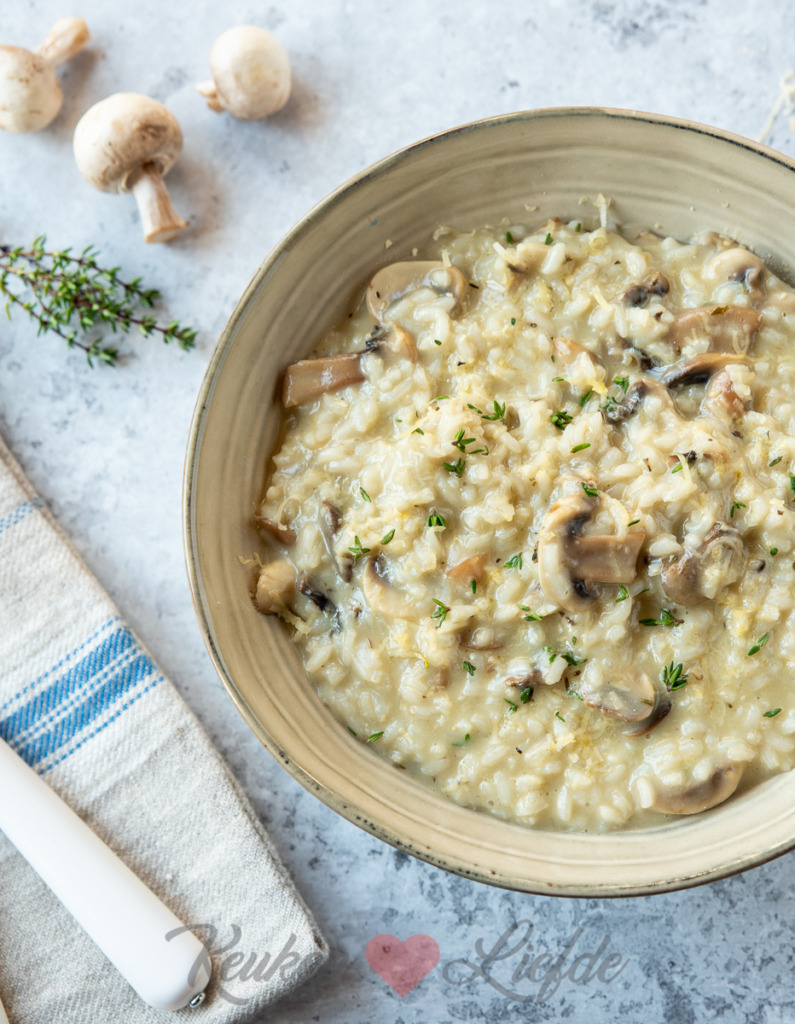 Ik heb altijd een pak risotto en bouillonblokjes in de kelderkast liggen om me uit de brand te helpen op een inspiratieloze kookdag. Met maar een paar ingrediënten tover je in een handomdraai een lekkere maaltijd op tafel. Deze vegetarische risotto met champignons is een van onze favorieten. Makkelijk om te maken en heerlijk vol van smaak!