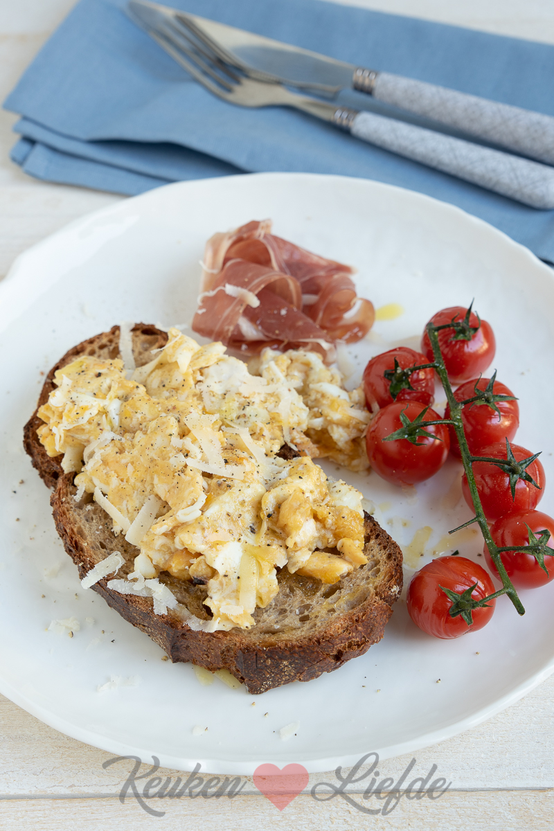 Verdeel het roerei over het toast en serveer met een de Parmaham, een trosje cherrytomaten en rasp er wat Parmezaan overheen. Bestrooi met zwarte peper uit de molen. Serveer direct.