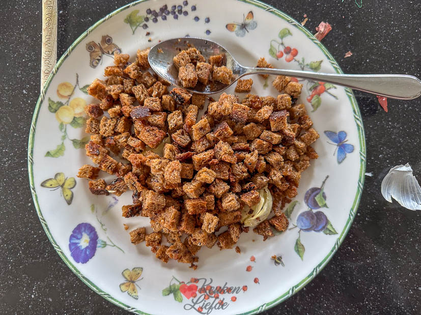 - Ook lekker om wat gefrituurde uitjes over de soep te strooien.