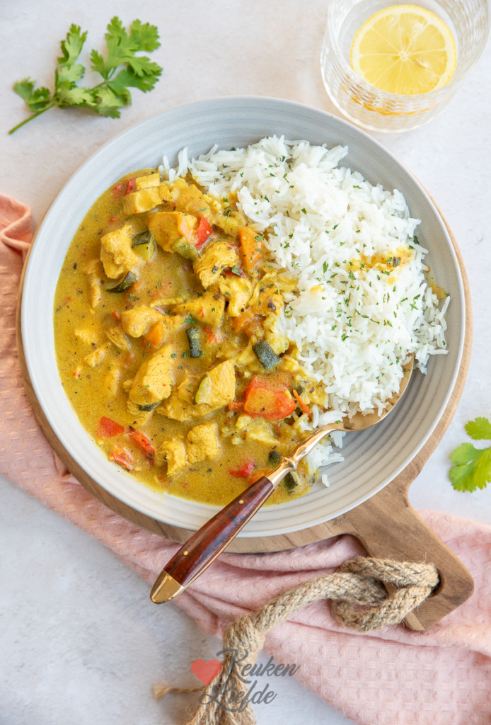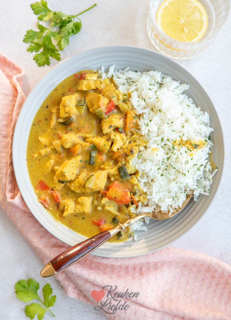 Een grote pan romige kip kerrie, geserveerd met witte rijst. Wie maak je daar nu niet blij mee! Deze kip kerrie is goed gevuld met verse groenten als courgette, wortel en paprika. Je hoeft er dus alleen nog wat rijst bij te koken.