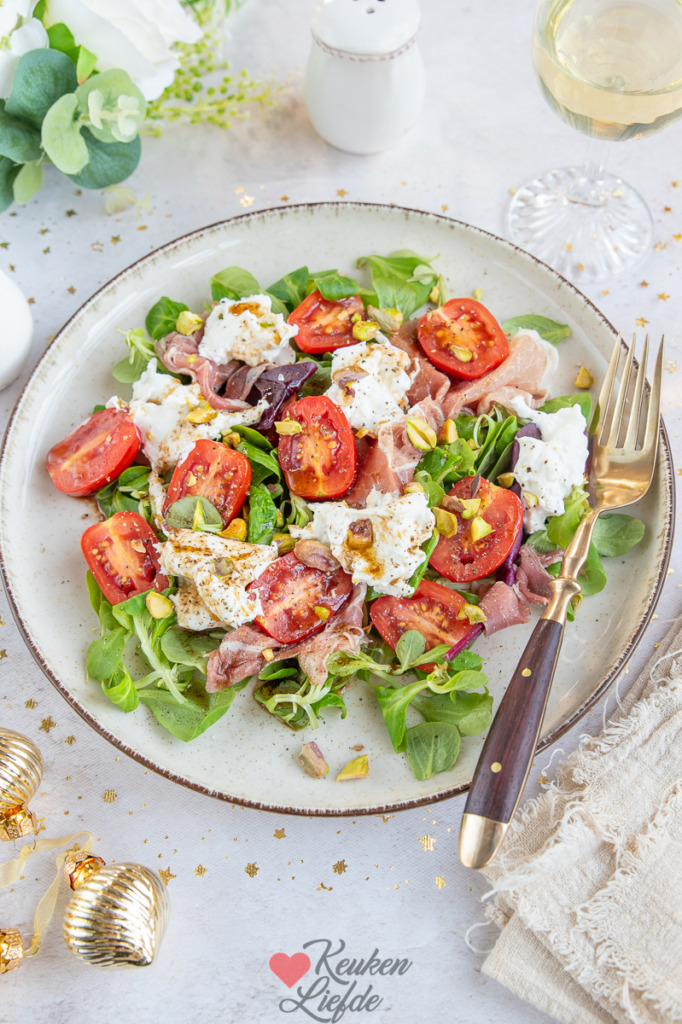 Een heerlijke salade met frisse tomaat, romige burrata en zoutige parmaham. De pistachenootjes geven een lekkere crunch en maken het helemaal af. Serveer deze salade als voorgerecht met kerst of een andere feestdag, of geniet ervan als lunch.