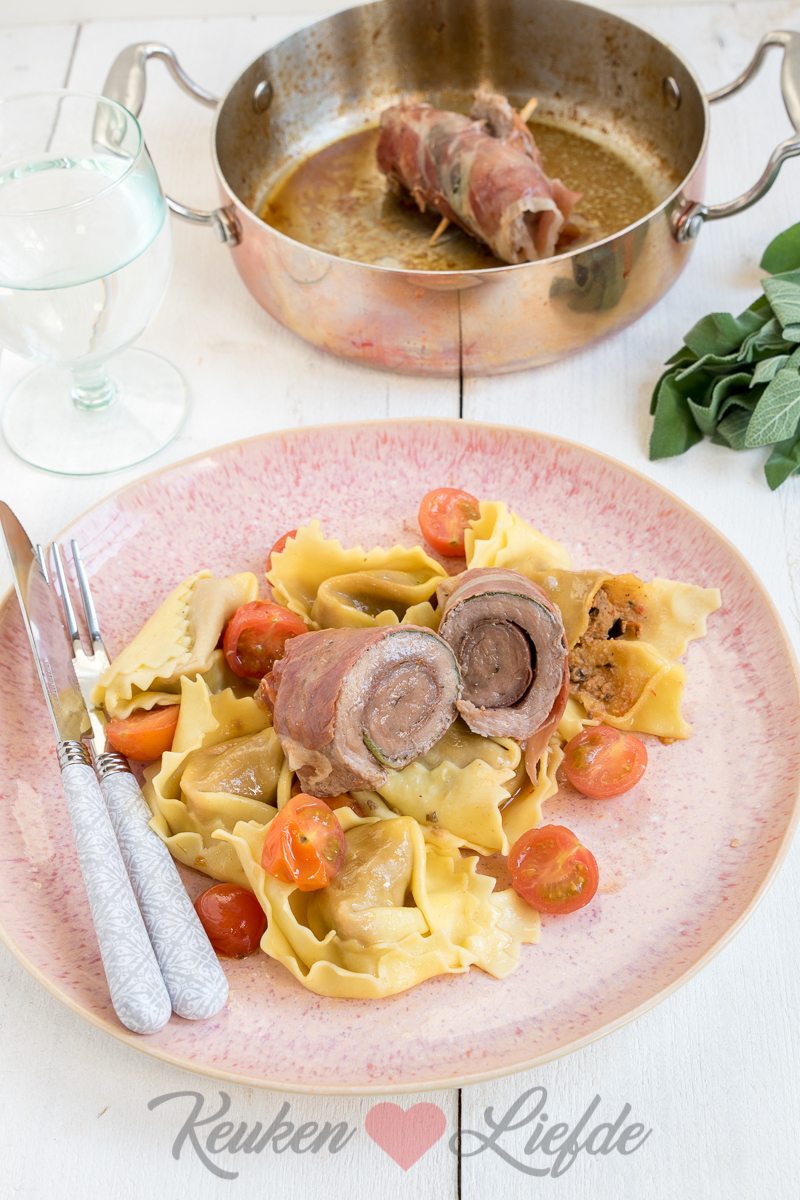 Kook ondertussen de tortelloni beetgaar volgens de omschrijving op het pak. Giet af en hussel om met een beetje olijfolie. Verdeel de tortelloni over 4 borden en serveer samen met de saltimbocca en wittewijnsaus.