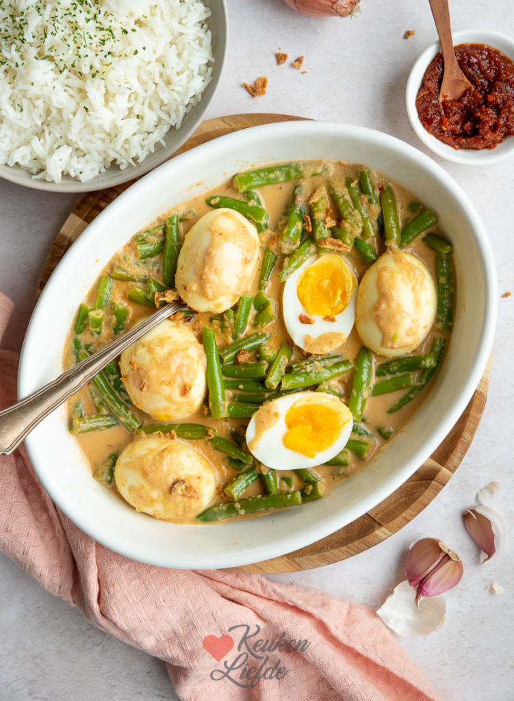 Sambal goreng telor met sperzieboontjes. Sambal goreng telor is een heerlijk Indonesisch gerecht met gekookte eieren in een licht pittige kokossaus met sambal. In deze variant voeg ik ook sperzieboontjes toe. Zo maak je er een heerlijk vegetarisch hoofdgerecht van waar je alleen nog wat rijst bij hoeft te serveren.