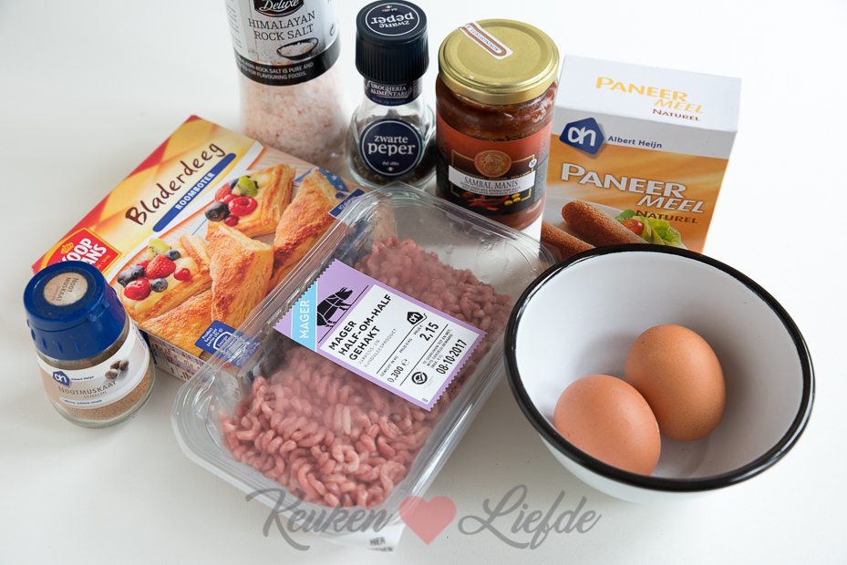 Doe het gehakt, paneermeel, 1 ei, sambal, nootmuskaat en zout en peper in een kom en kneed goed door. Vorm 9 rolletjes van het gehakt van dezelfde lengte als het bladerdeeg.