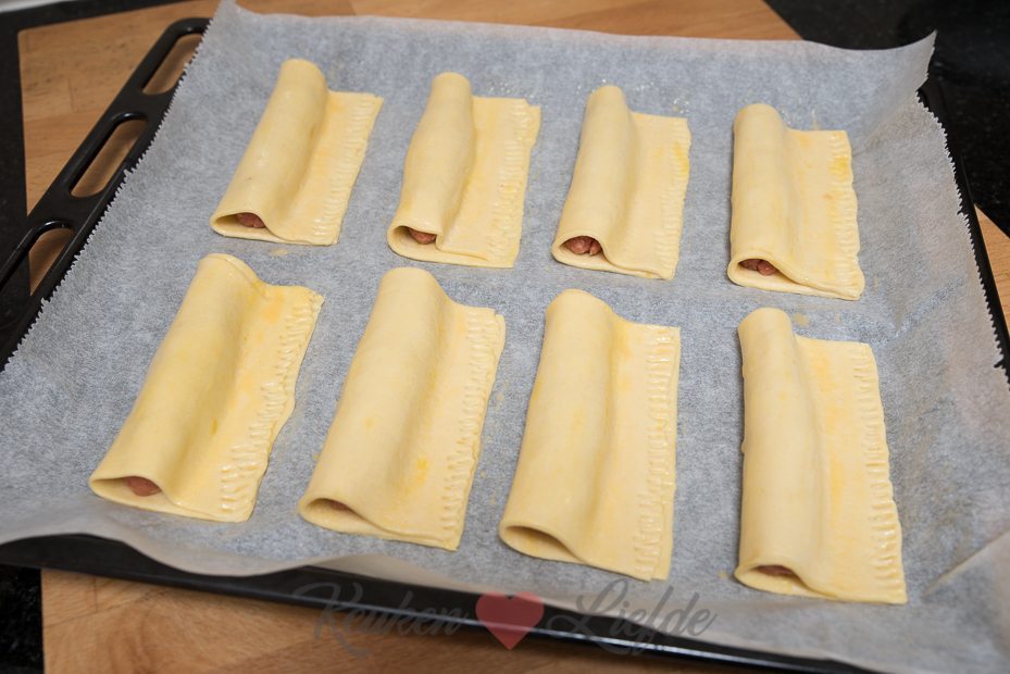 Verwijder het folie aan de onderkant van het bladerdeeg. Leg een rolletje gehakt op een plakje bladerdeeg, net iets onder het midden. Vouw het langste deel van het bladerdeeg over het gehakt en druk het bladerdeeg dicht. Duw de naden over de lange kant dicht met een vork.