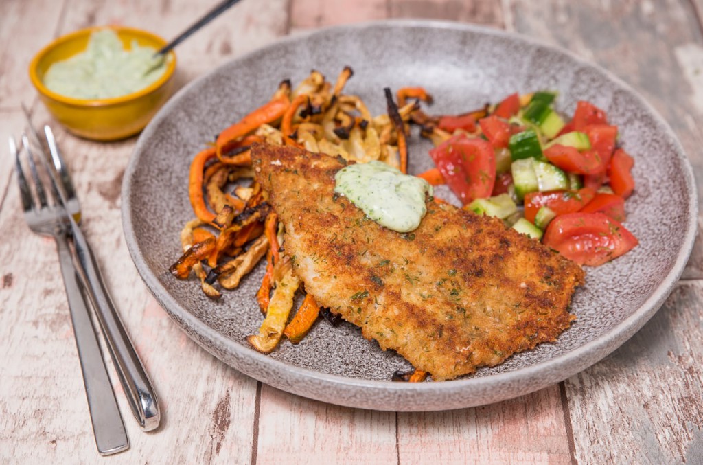 Serveer met rauwkost of salade en groentefriet uit de oven. Voor een lekker sausje mix je wat verse tuinkruiden (bijv. peterselie en bieslook) fijn met mayonaise. Smullen maar!