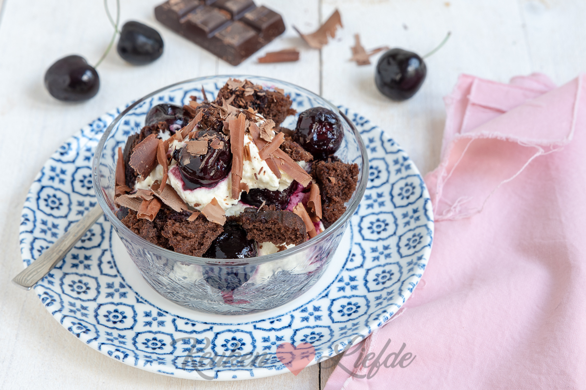 Dit schwarzwalder toetje zet je razendsnel op tafel en is net zo lekker als de bekende taart. De combinatie van chocoladecake, slagroom, kersen en Kirsch (kersenbrandewijn) is onweerstaanbaar.