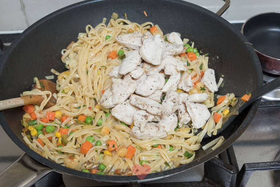 De zak wokgroenten die ik voor dit gerecht wilde gebruiken bleek over de datum te zijn dus moest ik iets anders bedenken. Gelukkig vond ik een zak diepvriessoepgroenten met wortel, prei, bloemkool, doperwten, knolselderij en tuinkruiden in de diepvries die ik kon gebruiken. Het resultaat was erg lekker! Lang leve de diepvries.